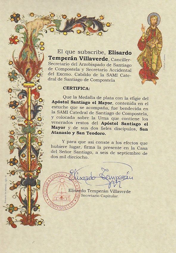 że srebrny medal z wizerunkiem św. Jakuba „Większego” został poświęcony w katedrze w Santiago de Compostela i został również położony na sarkofagu, który zawiera czcigodne szczątki Świętego Apostoła y jego dwóch uczniów, Świętego Atanazego i Świętego Teodora.